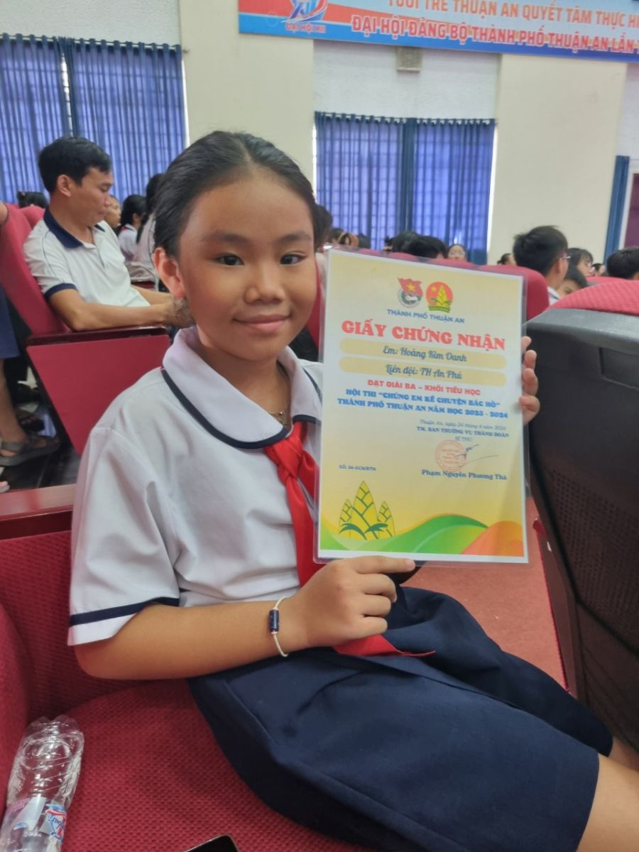 Căn cứ tình hình thực tế Liên đội trong công tác xây dựng và phát triển đội TNTP Hồ Chí Minh năm học 2023-2024. Nhằm khơi dậy trong thiếu nhi, nhi đồng tình cảm với Bác Hồ kính yêu, thi đua thực hiện tốt 5 điều Bác Hồ dạy hướng tới chào mừng kỷ niệm 83 năm ngày thành lập đội TNTP Hồ Chí Minh( 15/4/1941-15/4/2024), 134 năm ngày sinh chủ tịch Hồ Chí Minh (19/5/1890-19/5/2024), BTV thành đoàn - PGD và ĐT thành phố Thuận An tổ chức thực hiện Hội thi “ chúng em kể chuyện Bác Hồ năm học 2023-2024”. Thông qua Hội thi tạo môi trường cho đội viên, thiếu niên nhi đồng học tập , rèn luyện về đạo đức, lối sống , giúp các em phấn đấu trở thành con ngoan, trò giỏi, cháu ngoan Bác Hồ. Liên đội Tiểu học An Phú đại diện là đội viên Hoàng Kim Oanh chi đội lớp 5/4.