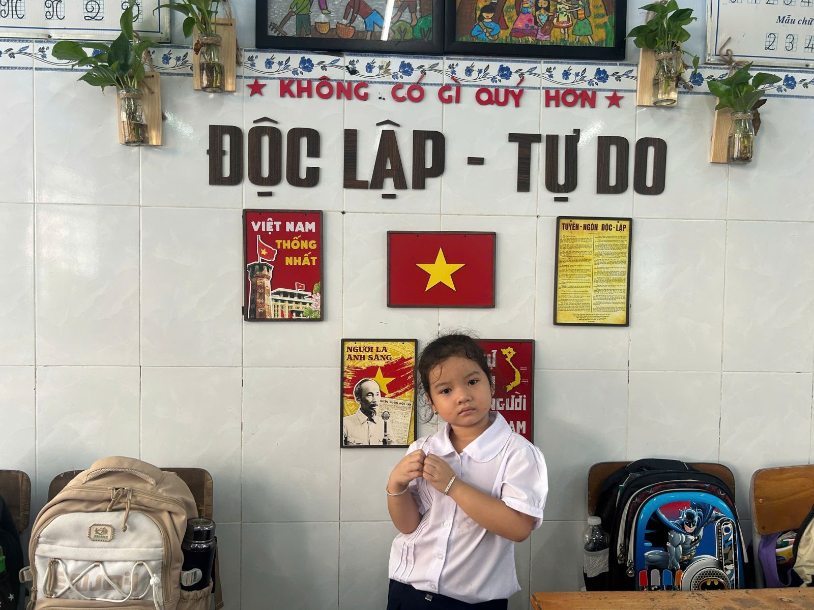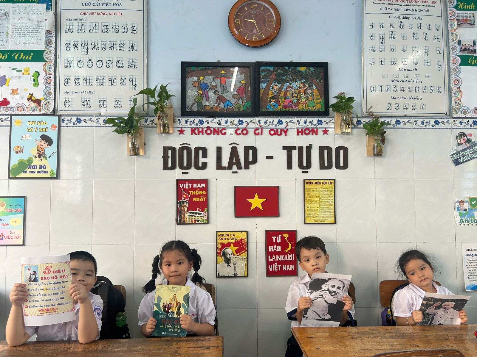 Ngay trong mỗi lớp học, một vị trí trang trọng được dành để treo ảnh Bác. Hình ảnh thân thương ấy trở thành lời nhắc nhở mỗi ngày, giúp các em học sinh luôn ghi nhớ 5 điều Bác Hồ dạy và phấn đấu trở thành con ngoan trò giỏi, cháu ngoan Bác Hồ.